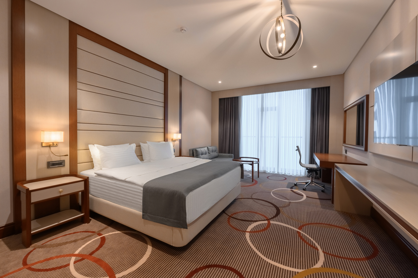 2 осн. места. 1 доп. место. Мебель: вешалка, зеркало, кровать двуспальная, прикроватные тумбочки, стол, стулья, шкаф. Оборудование: кондиционер, телевизор, холодильник, чайный набор посуды, электрочайник. Санузел: с душем, туалетные принадлежности, фен. Сервис: Wi-Fi бесплатно, смена полотенец, смена постельного белья, уборка номера.