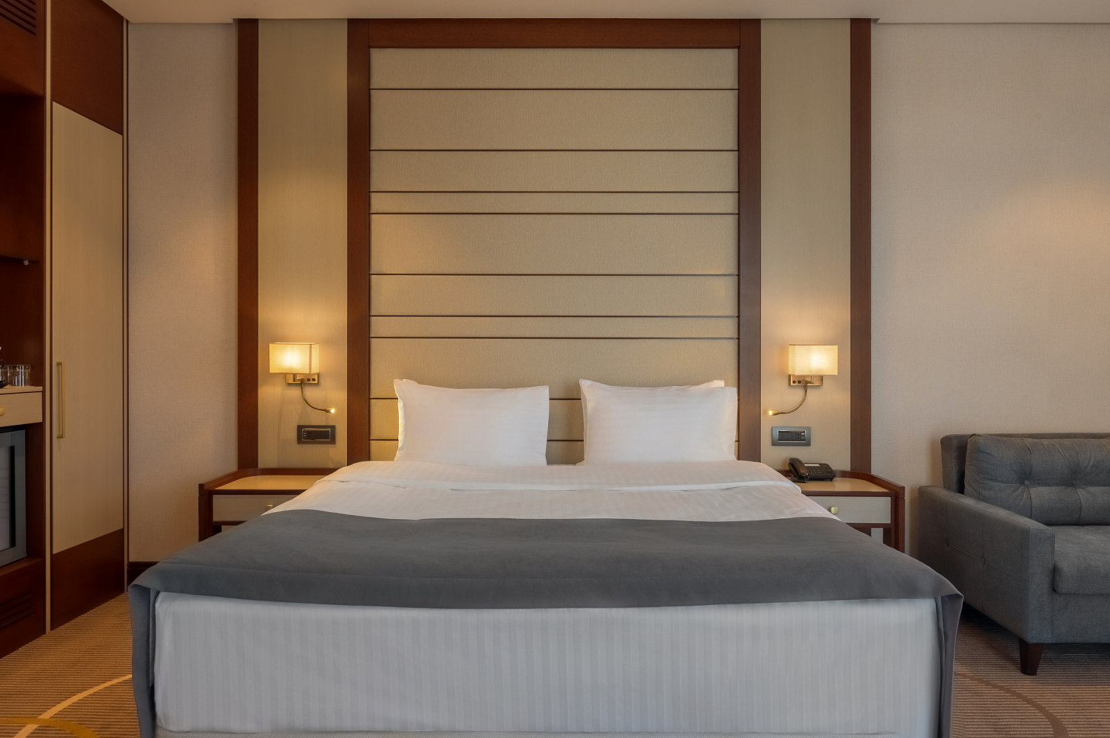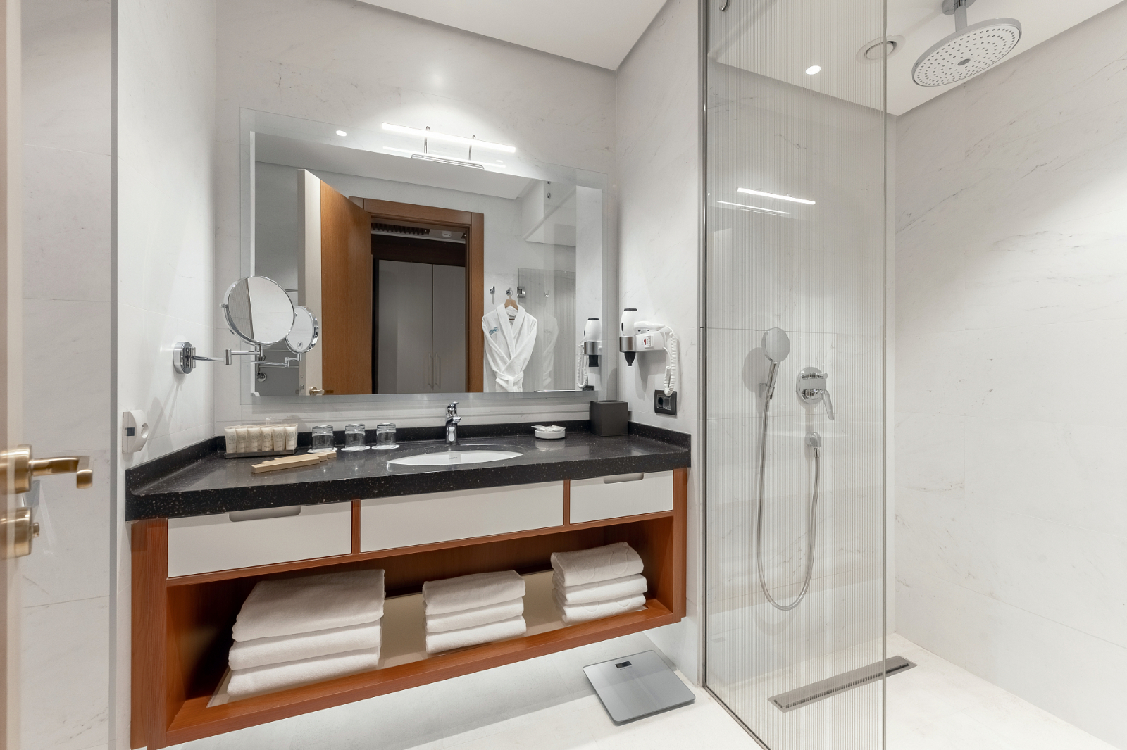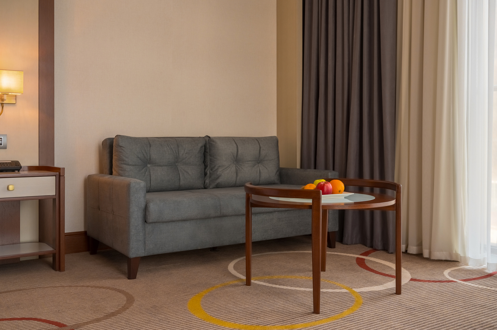 Площадь номера - 41 кв.м. 2 осн. места. 1 доп. место. Балкон. Мебель: вешалка, диван раскладной, зеркало, кровать двуспальная, прикроватные тумбочки, стол (письменный), стул, шкаф. Оборудование: мини-холодильник, сейф, сплит-система, телевизор ЖК, чайный набор посуды, электрочайник. Санузел: с душем, тапочки, туалетные принадлежности, фен, халат. Сервис: Wi-Fi бесплатно, смена полотенец, смена постельного белья, уборка номера.