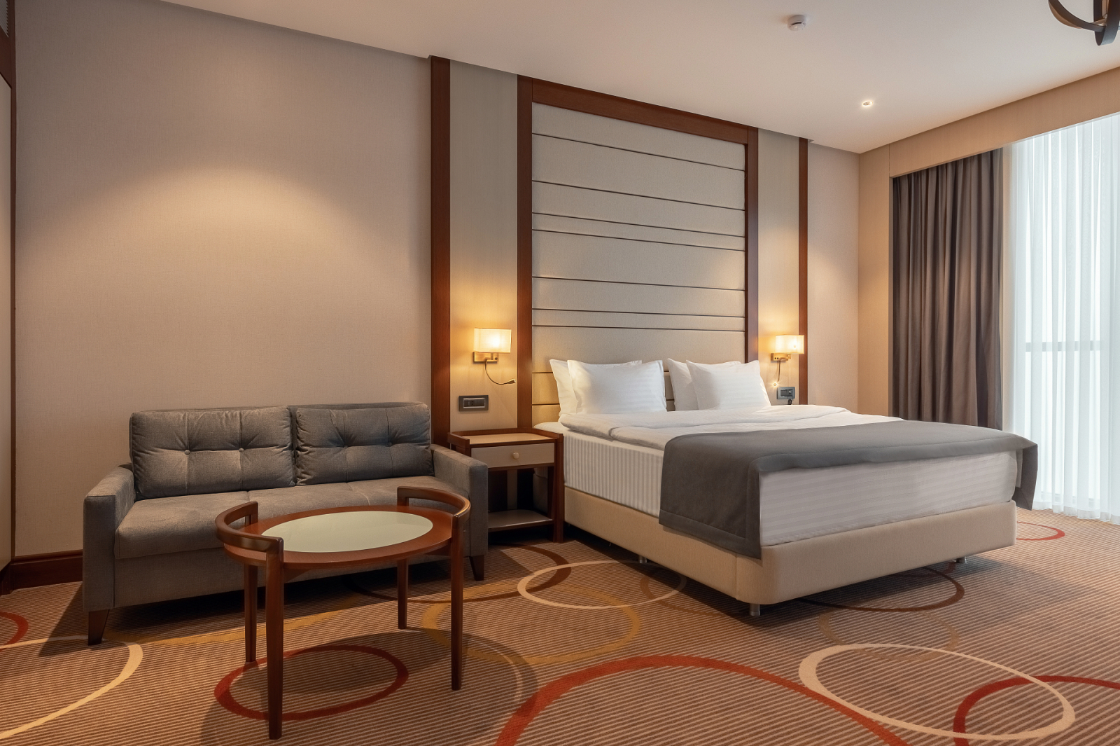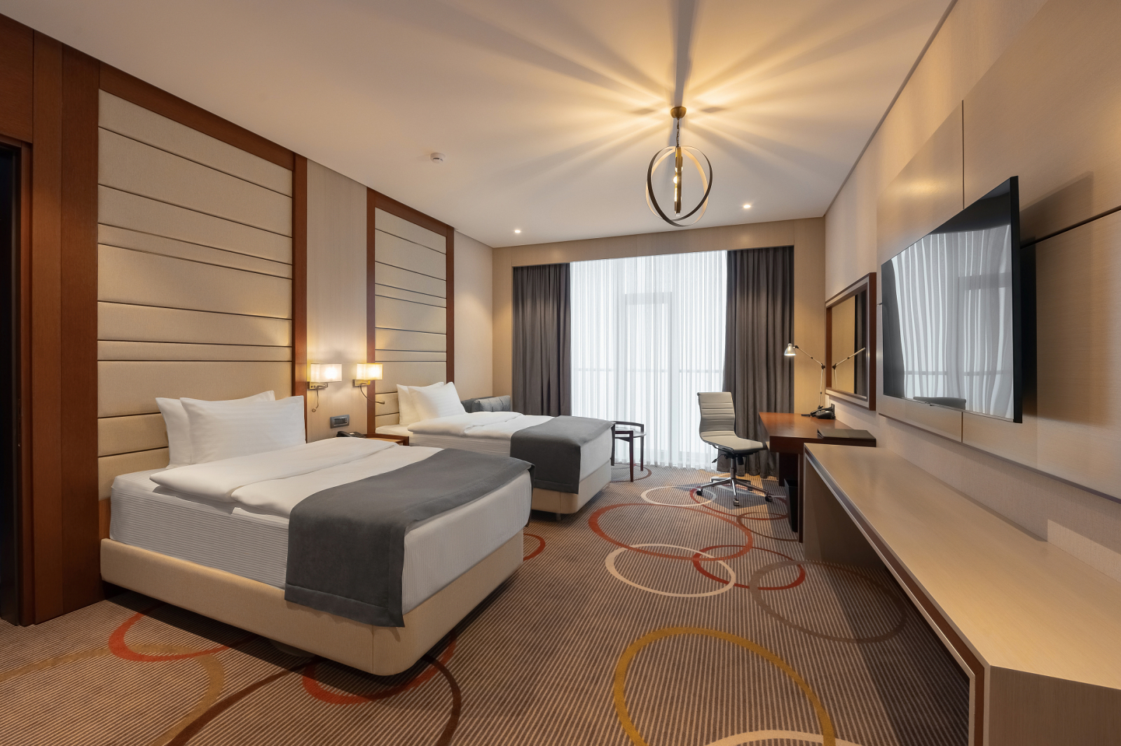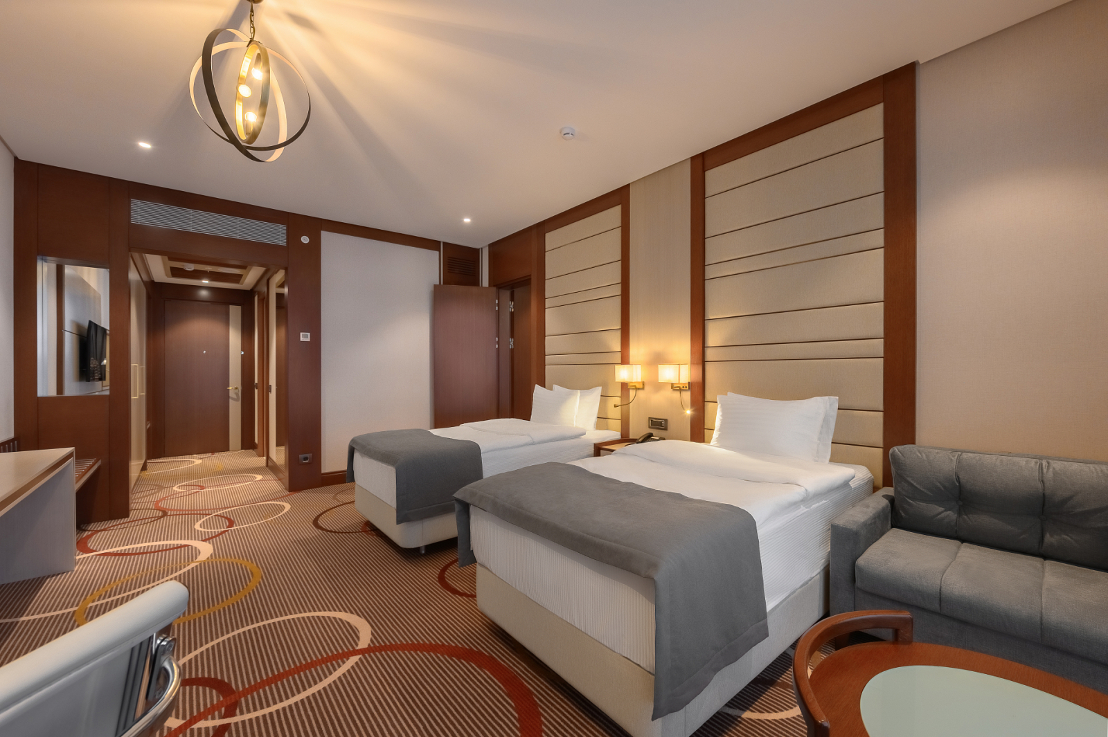 Площадь номера - 108 кв.м. 4 осн. места. 2 доп. места. Балкон. Мебель: вешалка, диван раскладной (2), зеркало, кресло-кровать, кровати односпальные (2), кровать двуспальная, прикроватные тумбочки, стол ((письменный) 2), столик туалетный, стулья, шкаф. Оборудование: мини-холодильник, сейф, сплит-система, телевизор ЖК (3), телефон, чайный набор посуды, электрочайник. Санузел: 3 санузла, биде, с душевой кабиной (3), тапочки, туалетные принадлежности, фен, халат. Сервис: Wi-Fi бесплатно, смена полотенец, смена постельного белья, уборка номера.