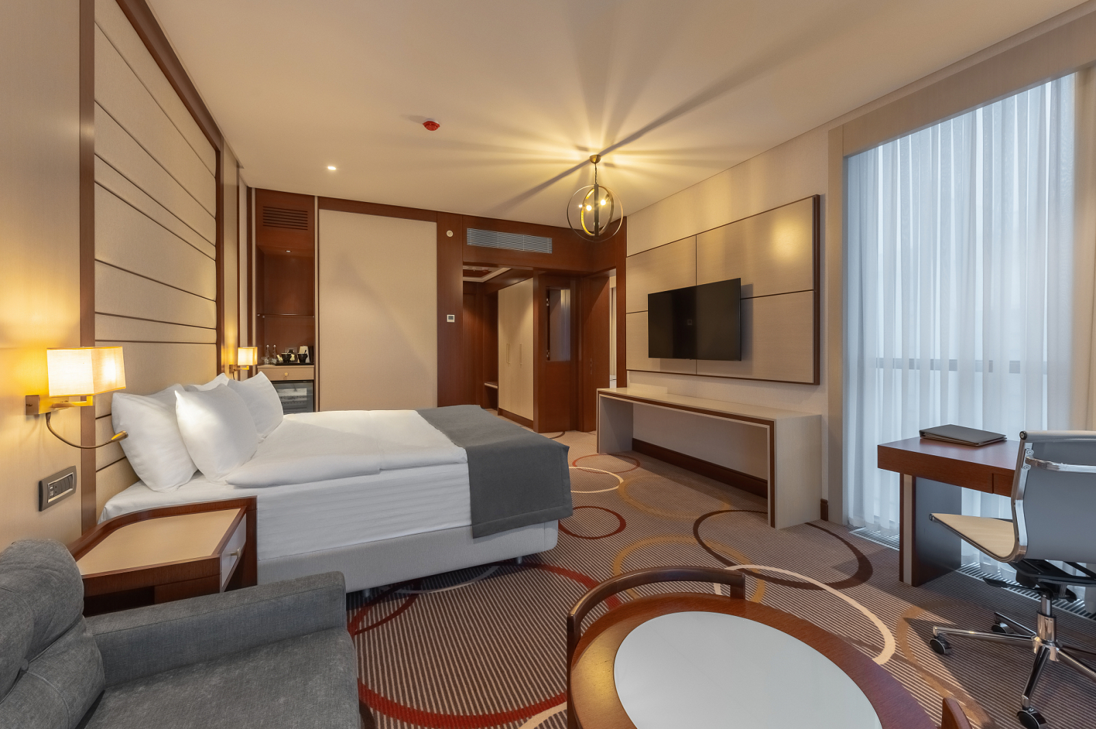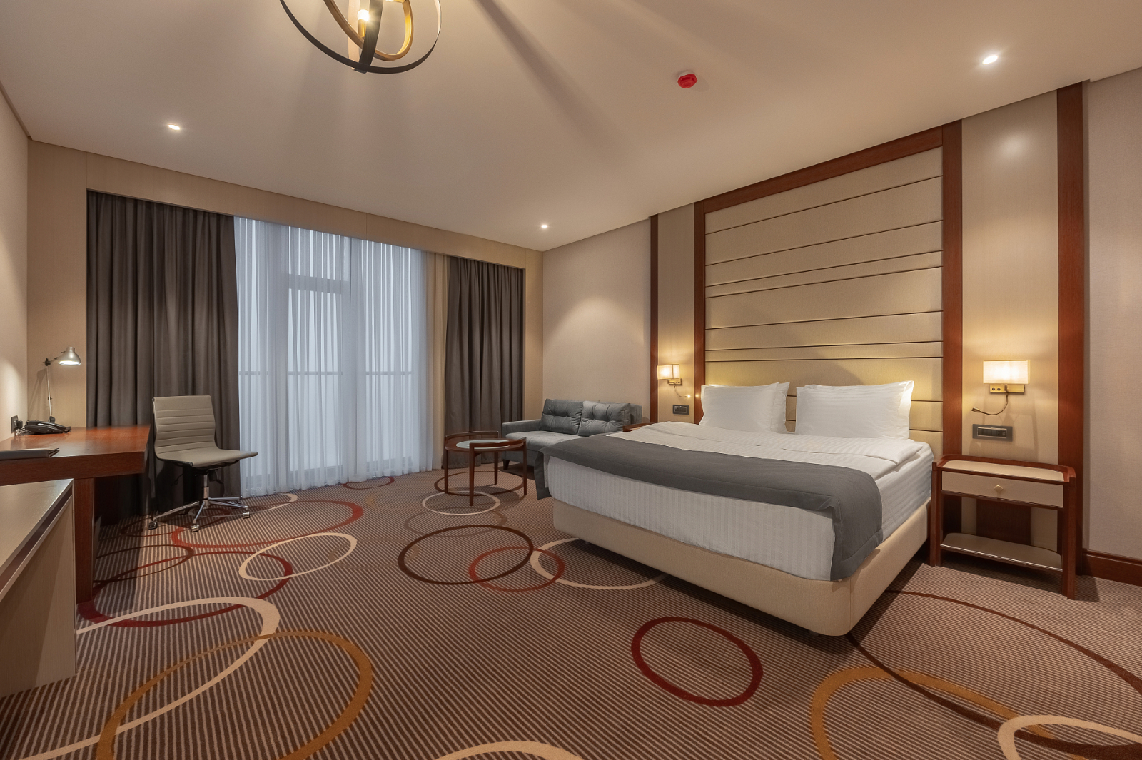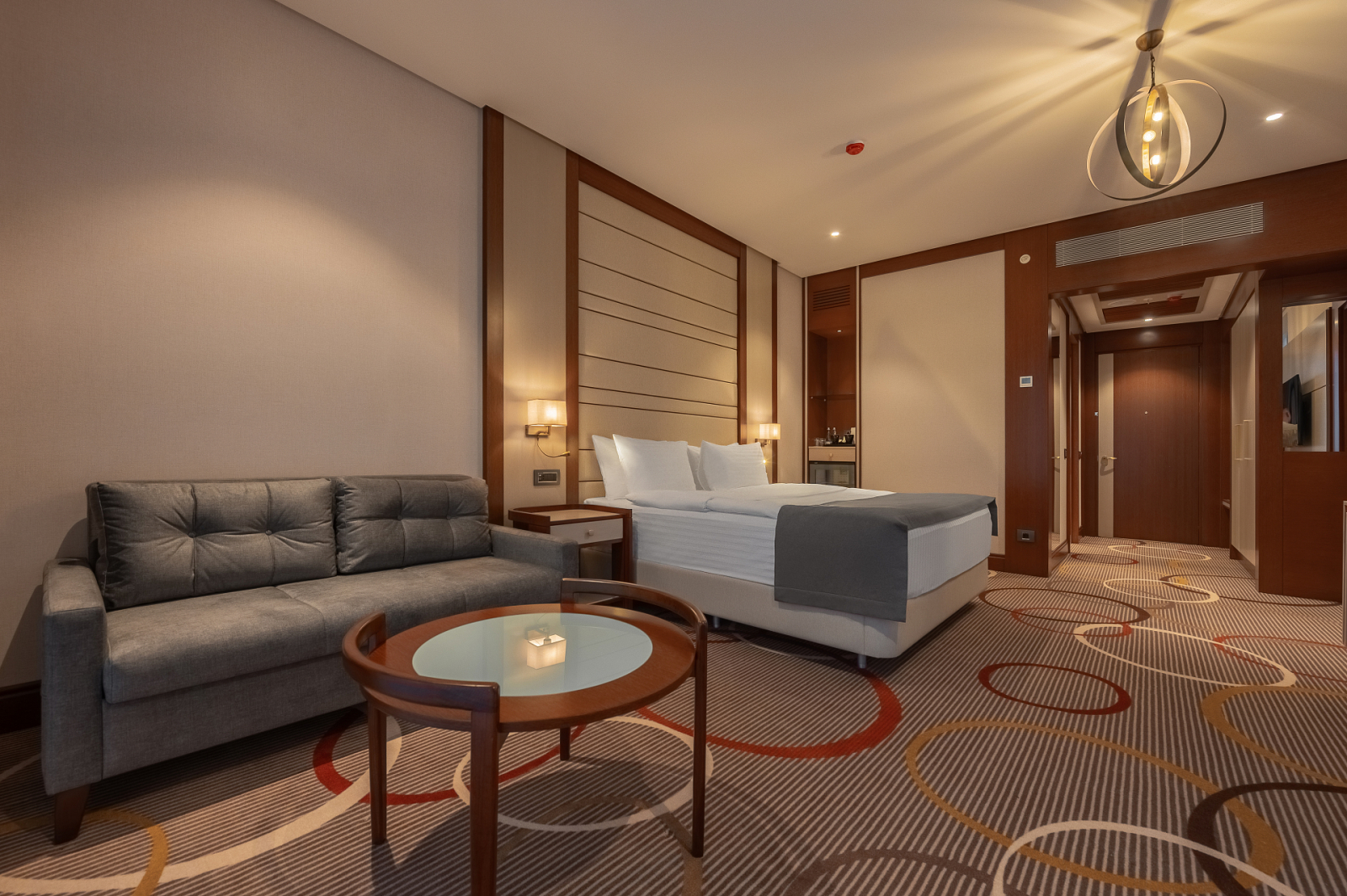 Площадь номера - 45 кв.м. 3 осн. места. 2 доп. места. Балкон. Мебель: вешалка, диван раскладной, зеркало, кровать двуспальная, кровать односпальная, прикроватные тумбочки, стол ((письменный)), стул, шкаф. Оборудование: мини-холодильник, сейф, сплит-система, телевизор ЖК, чайный набор посуды, электрочайник. Санузел: с душем, тапочки, туалетные принадлежности, фен, халат. Сервис: Wi-Fi бесплатно, смена полотенец, смена постельного белья, уборка номера.